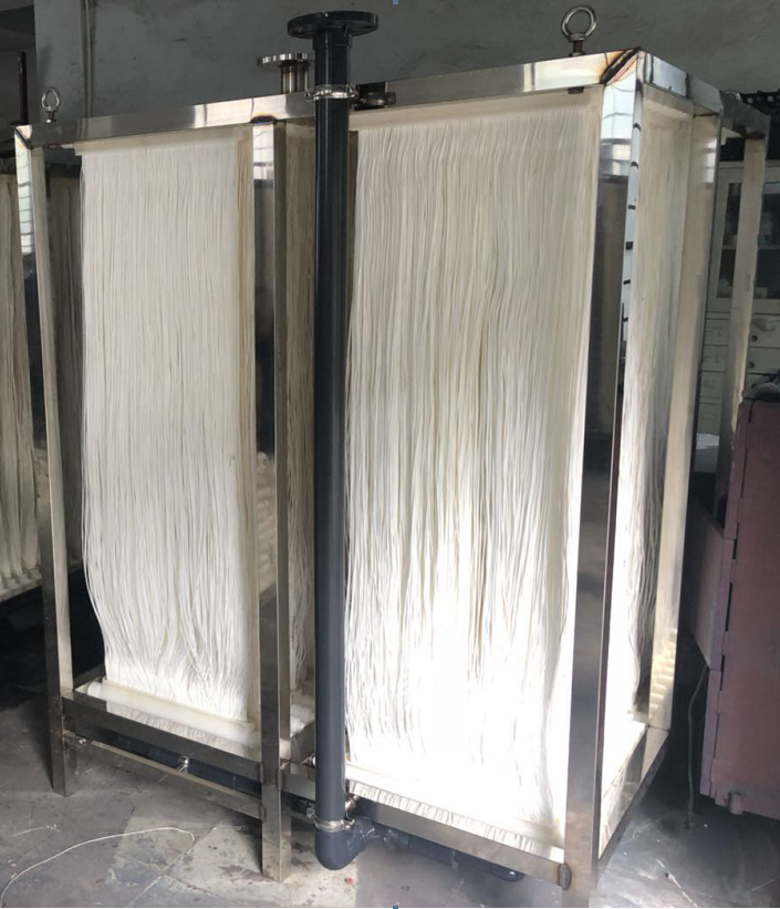 系統(tǒng)運行時,采用恒定流量辦法,抽吸負壓可通過電接點式壓力表讀取,初始膜片操作負壓在-0.01 ~ -0.03Mpa。當條件許可時,出水可采用虹吸方式,但生化池液位與出水水池液位差應在3.0-4.0米以上,則膜片的更不易污染,出水更穩(wěn)定,使用周期更長。當操作負壓超過-0.06MPa時,需對膜片及時進行化學清洗。清洗方法是將膜堆置于化學清洗池或者膜組件片從膜架上取下,用清水對膜片表面進行沖洗,除去膜片表面附著的活性污泥,再用0.5%NaClO溶液浸泡1小時,殺死附著在膜表面的細菌,然后用5%的NaOH溶液將膜片浸泡2小時,除去附著在膜片表面的有機物和膠體物質(zhì),再用清水對膜片進行沖洗,膜片通量即可恢復。若水中的鹽類物質(zhì)較多容易在膜表面結(jié)垢,可先用2~3%的鹽酸浸泡約1小時。清洗工作應十分小心,嚴防損壞膜絲。